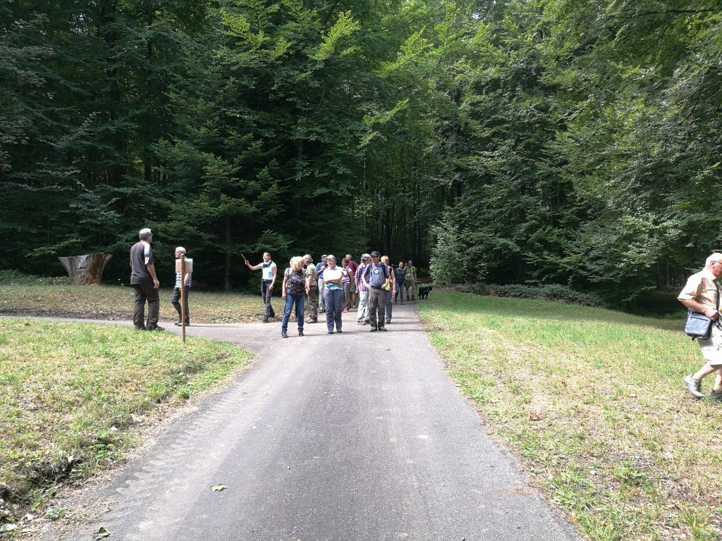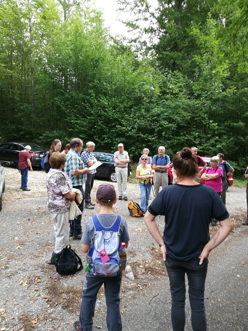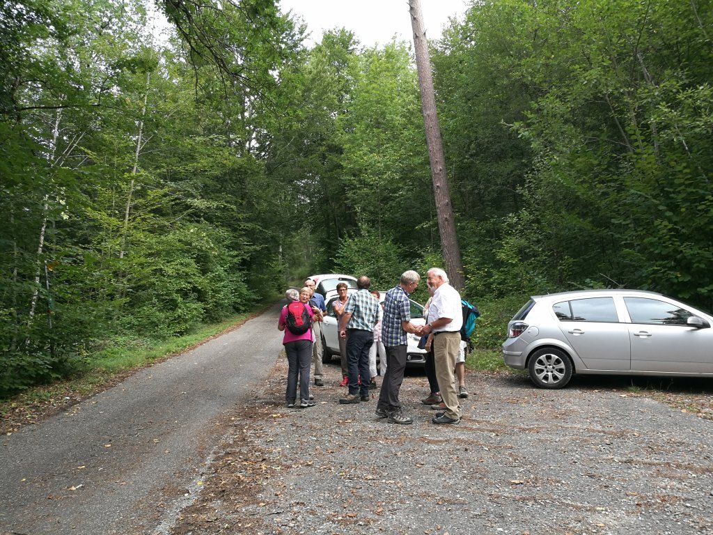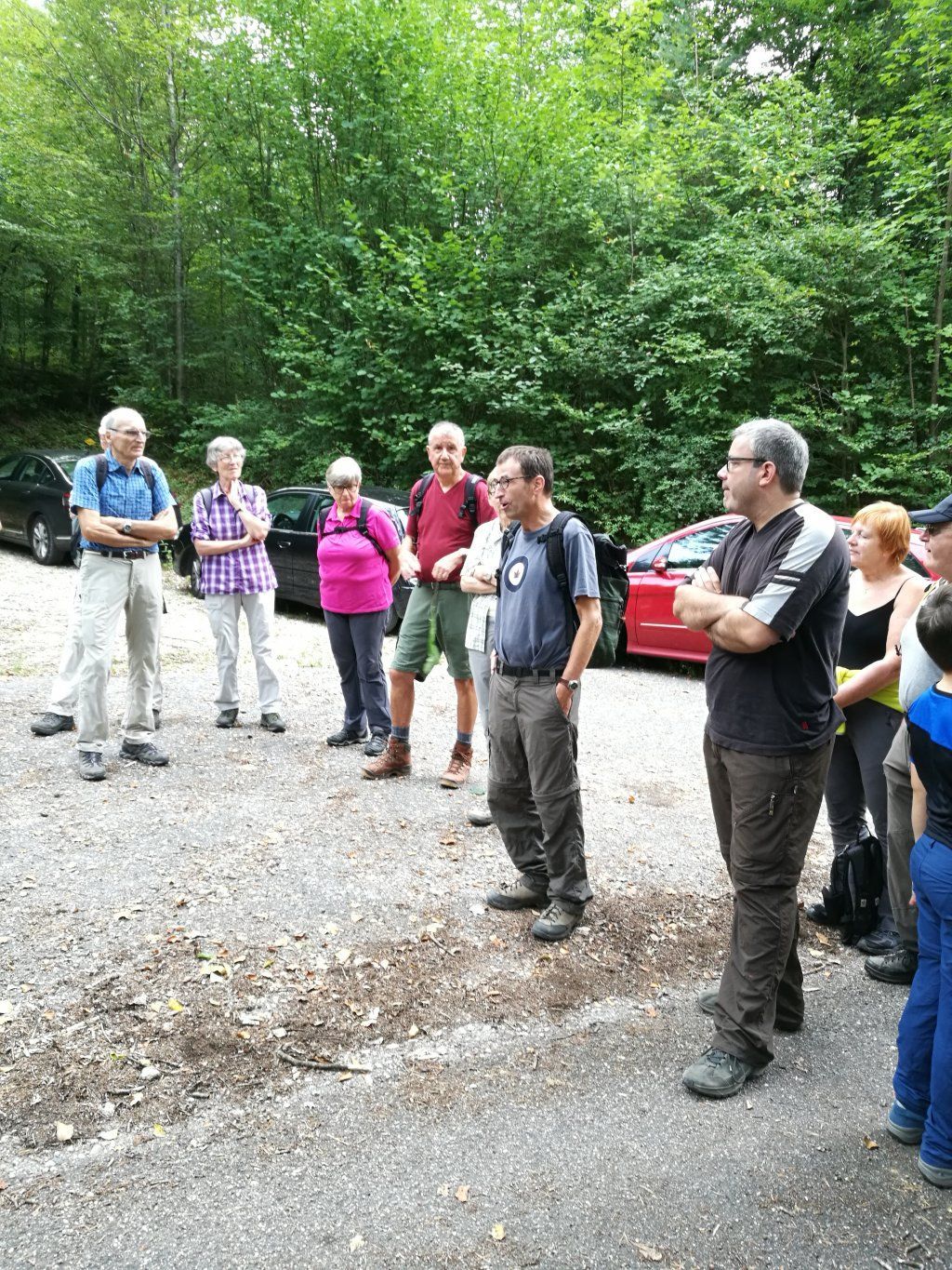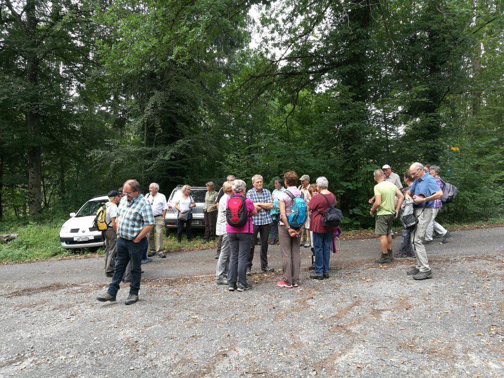 Mit dem Kleinbus wurde in den Bueberg verschoben, wo dann der Förster die Interessierten zur Exkursion durch den Vorstadtburgerwald empfing.